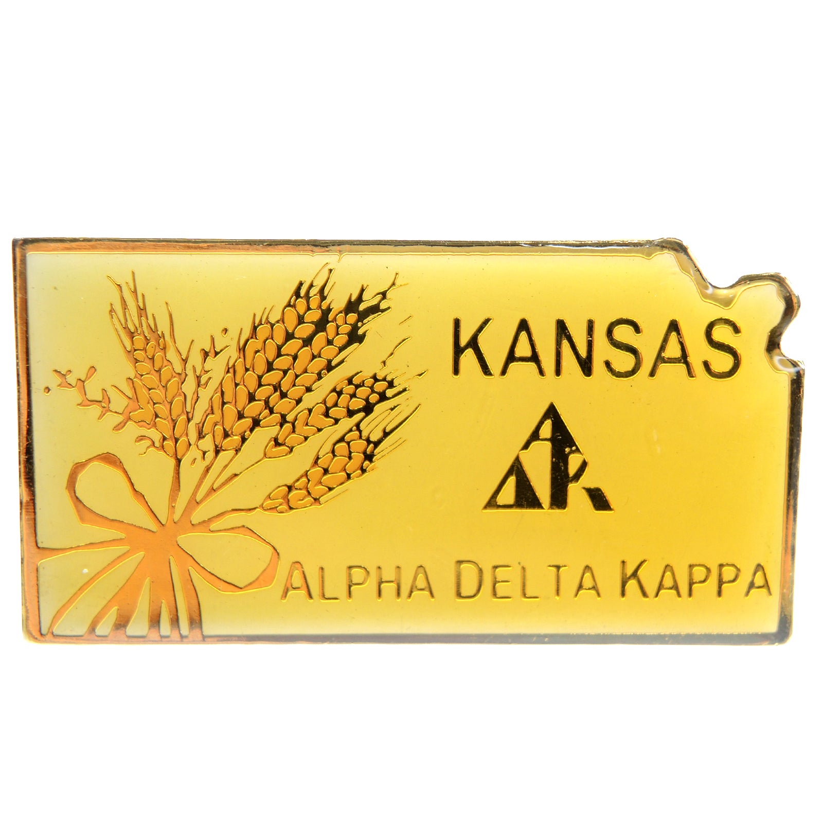 This lapel pin features a yellow background with the shape of the state of Kansas. The word KANSAS is prominently displayed at the top, and below it are the letters ADK. Below these letters is the text ALPHA DELTA KAPPA. On the left side of the pin, there is an illustration of wheat tied with a bow.
