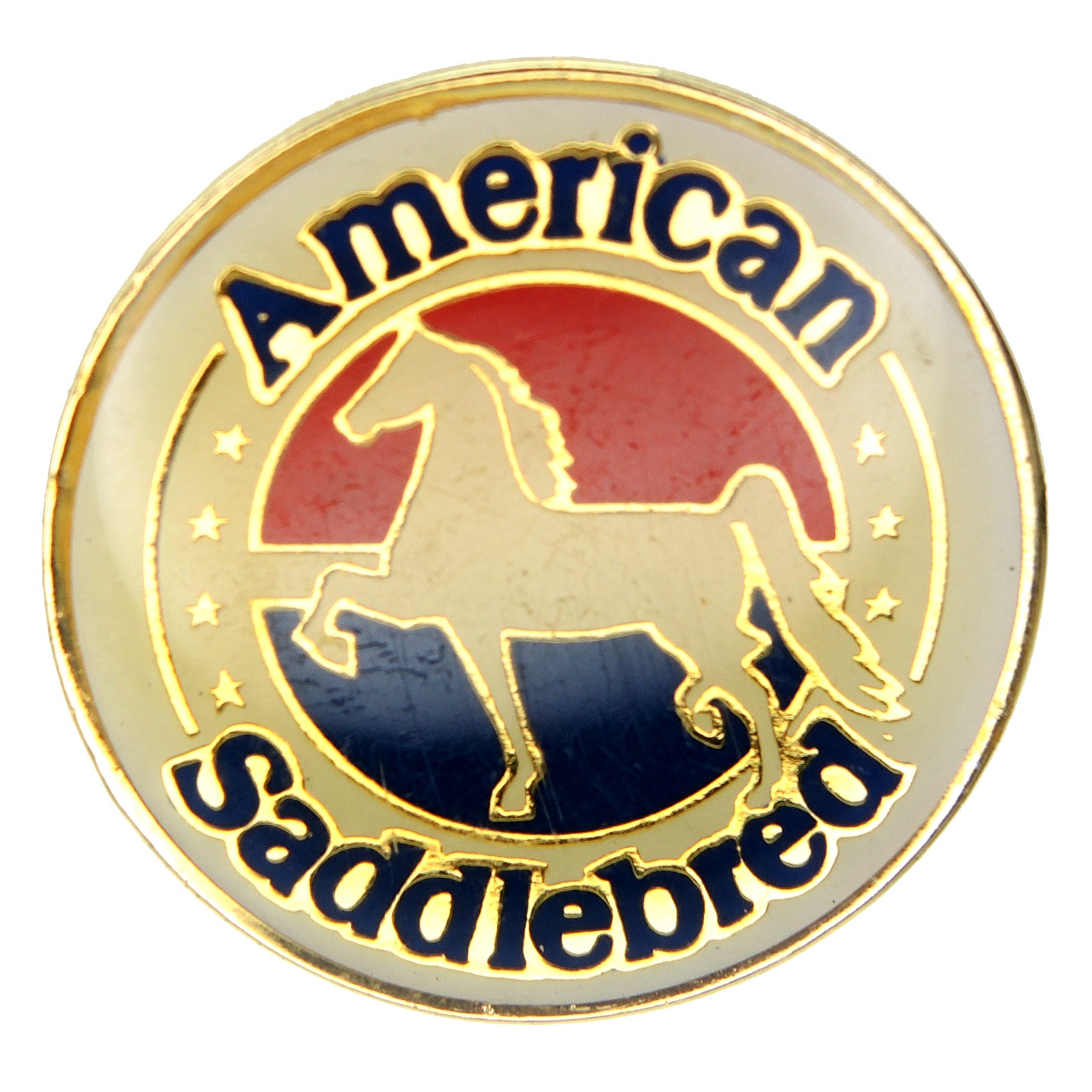 This American Saddlebred Horse Lapel Pin is a large, high-quality pin that features the iconic silhouette of an American Saddlebred horse. The pin has a gold-tone finish and measures approximately 1.5 inches in diameter.