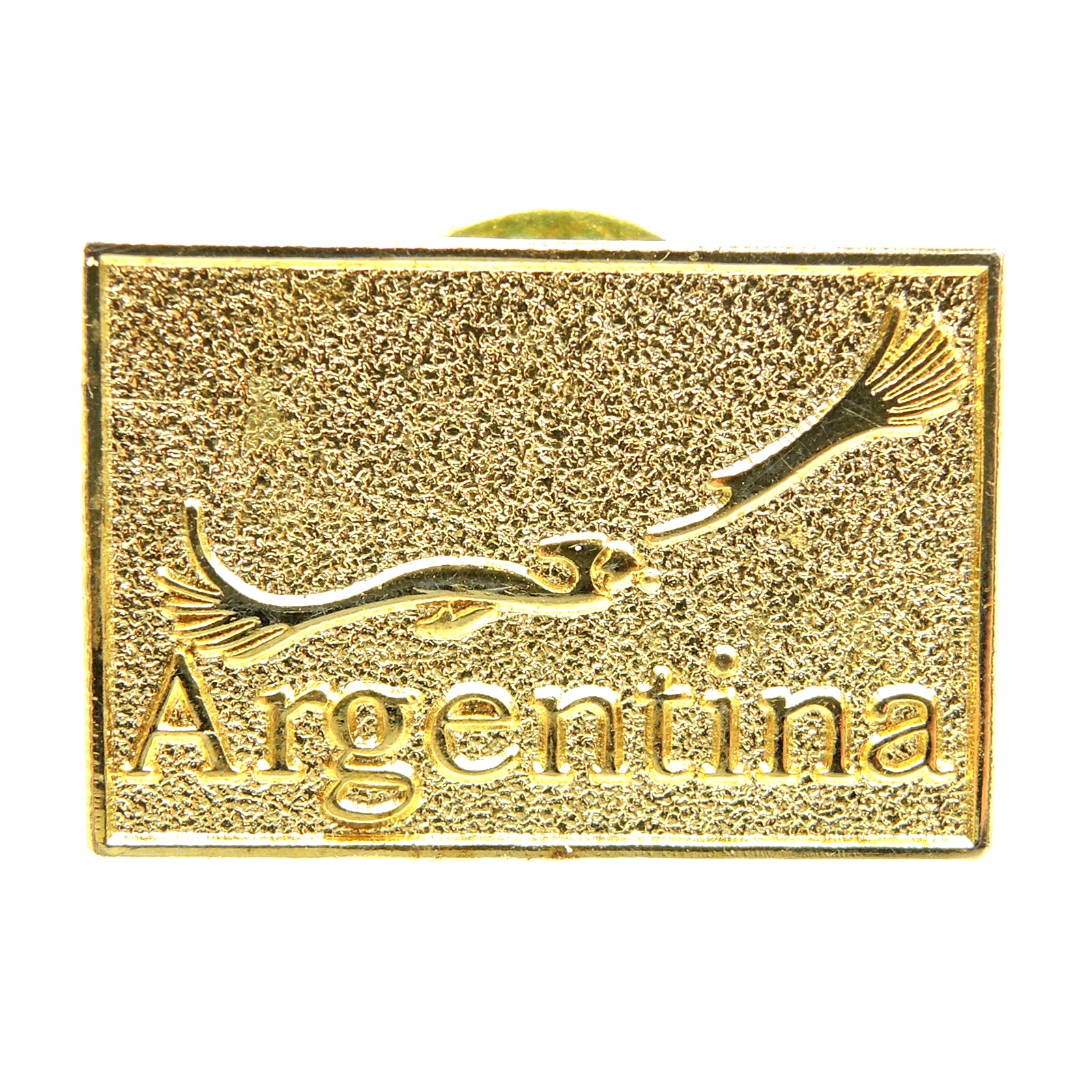 This rectangular goldtone lapel pin features a bird in flight, with the word Argentina inscribed below. The pin is designed to be worn on clothing or accessories as a decorative accent.