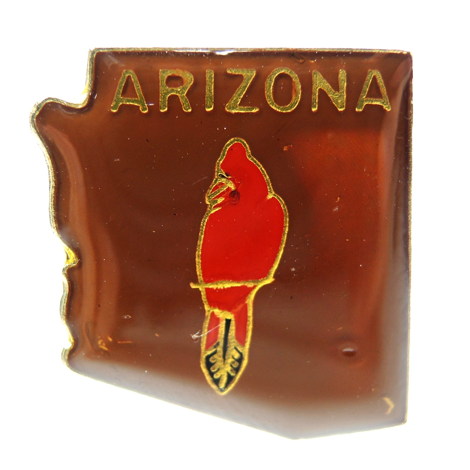 This lapel pin features an outline of the state of Arizona with a cardinal bird in the center. The pin is made of metal and has a clutch back for secure fastening.