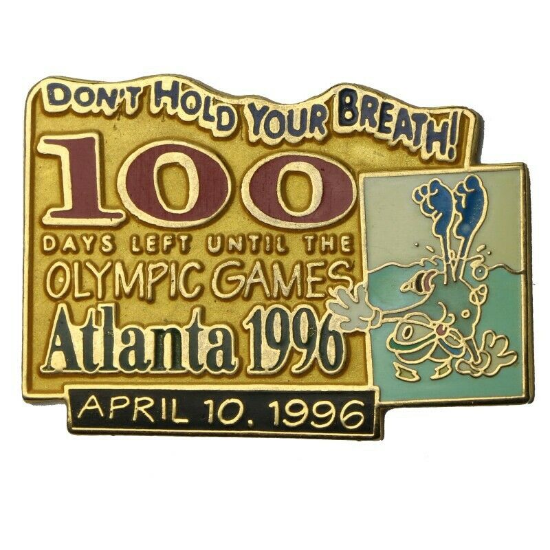 This pin commemorates the countdown to the 1996 Summer Olympics held in Atlanta. The text on the pin reads Dont Hold Your Breath! 100 Days Left Until the Olympic Games Atlanta 1996 April 10, 1996. It features Izzy, the official mascot of the Atlanta 1996 games.
