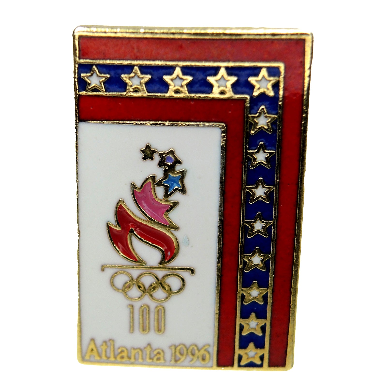 This lapel pin commemorates the Atlanta 1996 Summer Olympic Games. It features a patriotic rectangle design with a torch symbol.