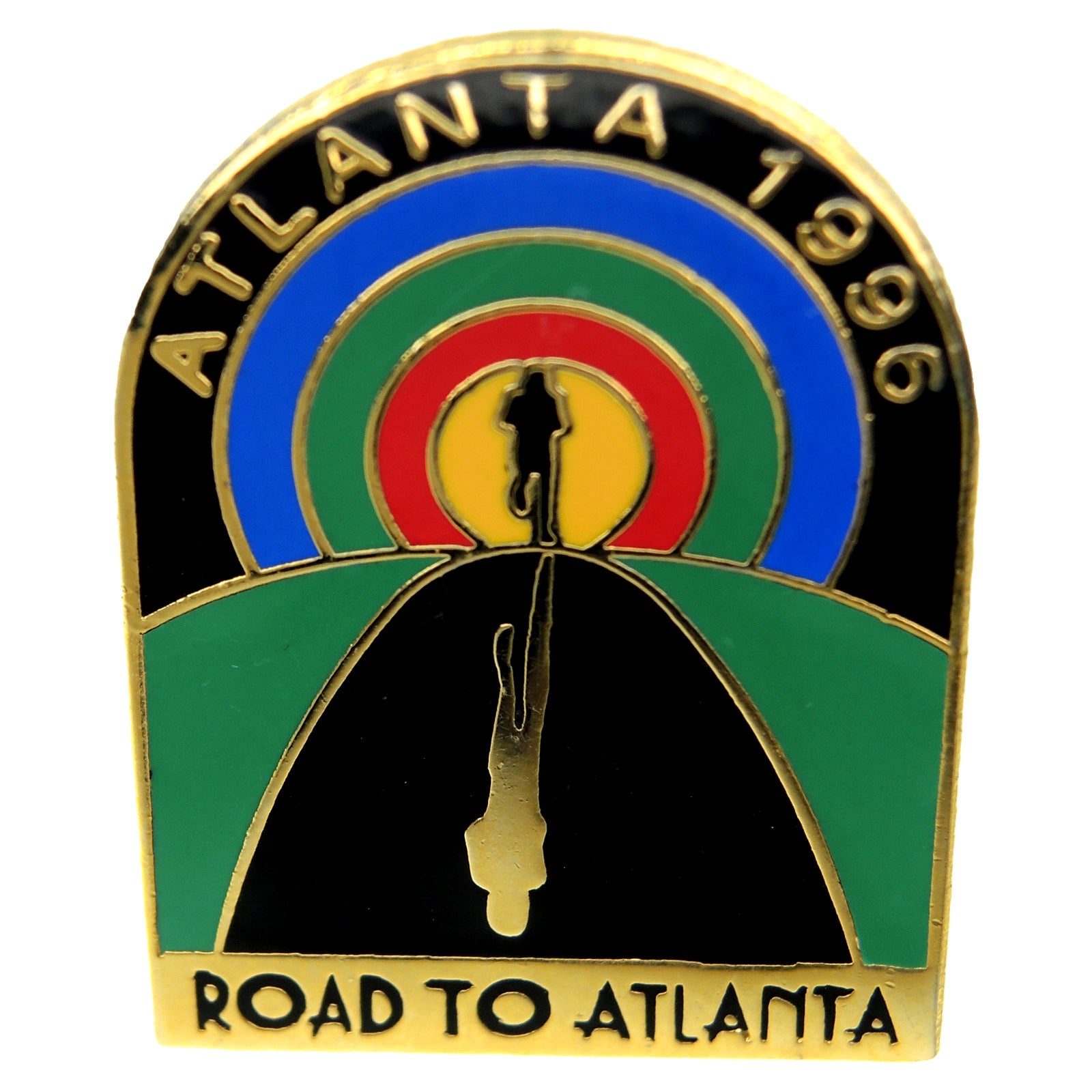 This lapel pin commemorates the Atlanta 1996 Summer Olympic Games. The design features a runner on a road leading up to a rainbow with the text Atlanta 1996 and Road to Atlanta.