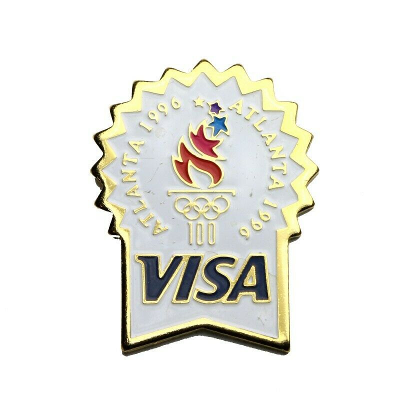 This lapel pin commemorates the Atlanta 1996 Summer Olympic Games and features a white burst design with the Visa logo prominently displayed. The pin is a collectible item for fans of the Olympics and banking enthusiasts alike.