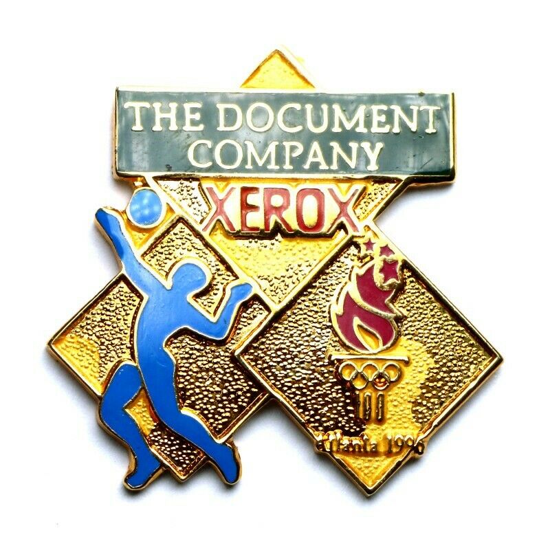 The Atlanta 1996 Summer Olympic Games Xerox Volleyball Lapel Pin is a collectible item that celebrates the sporting event held in Atlanta, Georgia, USA in 1996. The lapel pin showcases a dynamic image of a volleyball player in mid-air, executing a powerful spike. The design is set against a gold background with blue accents, creating a striking contrast. The pin also features the Xerox logo prominently displayed at the top, indicating that it was manufactured by the company. The Atlanta 1996 Summer Olympic Games Xerox Volleyball Lapel Pin serves as a memorable keepsake for fans of volleyball and the Olympic Games.