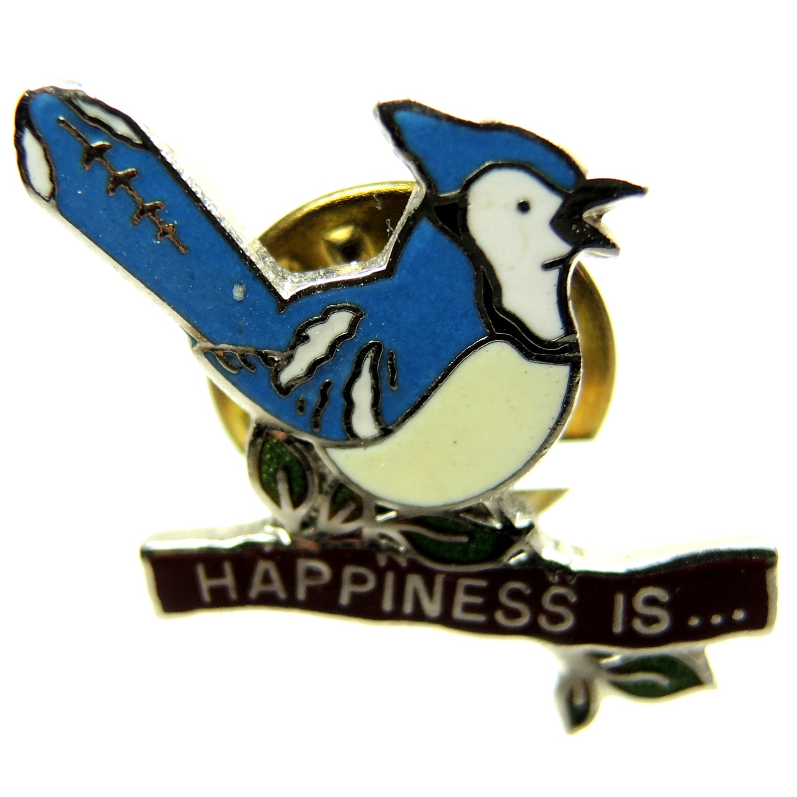 This beautiful Blue Jay Happiness Is Lapel Pin is a must-have for any collection.