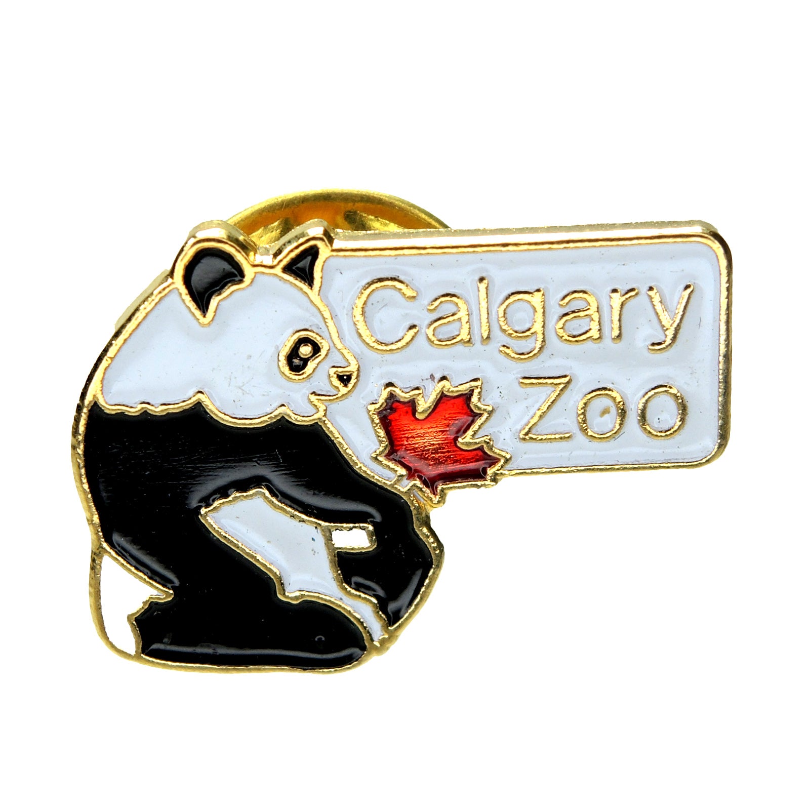 To celebrate this occasion, the Calgary Zoo issued a commemorative lapel pin. The pin is designed with a black and white panda holding a red maple leaf, symbolizing Canadas national emblem. The words Calgary Zoo are inscribed on the pin in gold lettering, adding a touch of elegance.