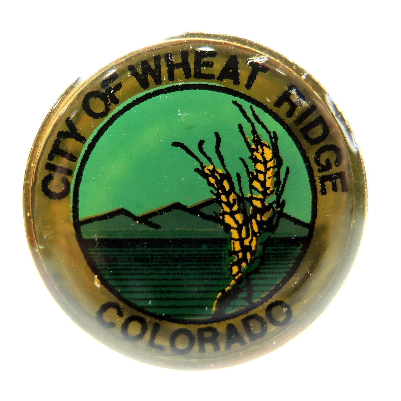 The image depicts a lapel pin featuring the logo of the City of Wheat Ridge, Colorado. The design includes a green background with an illustration of wheat stalks and mountains in the distance.