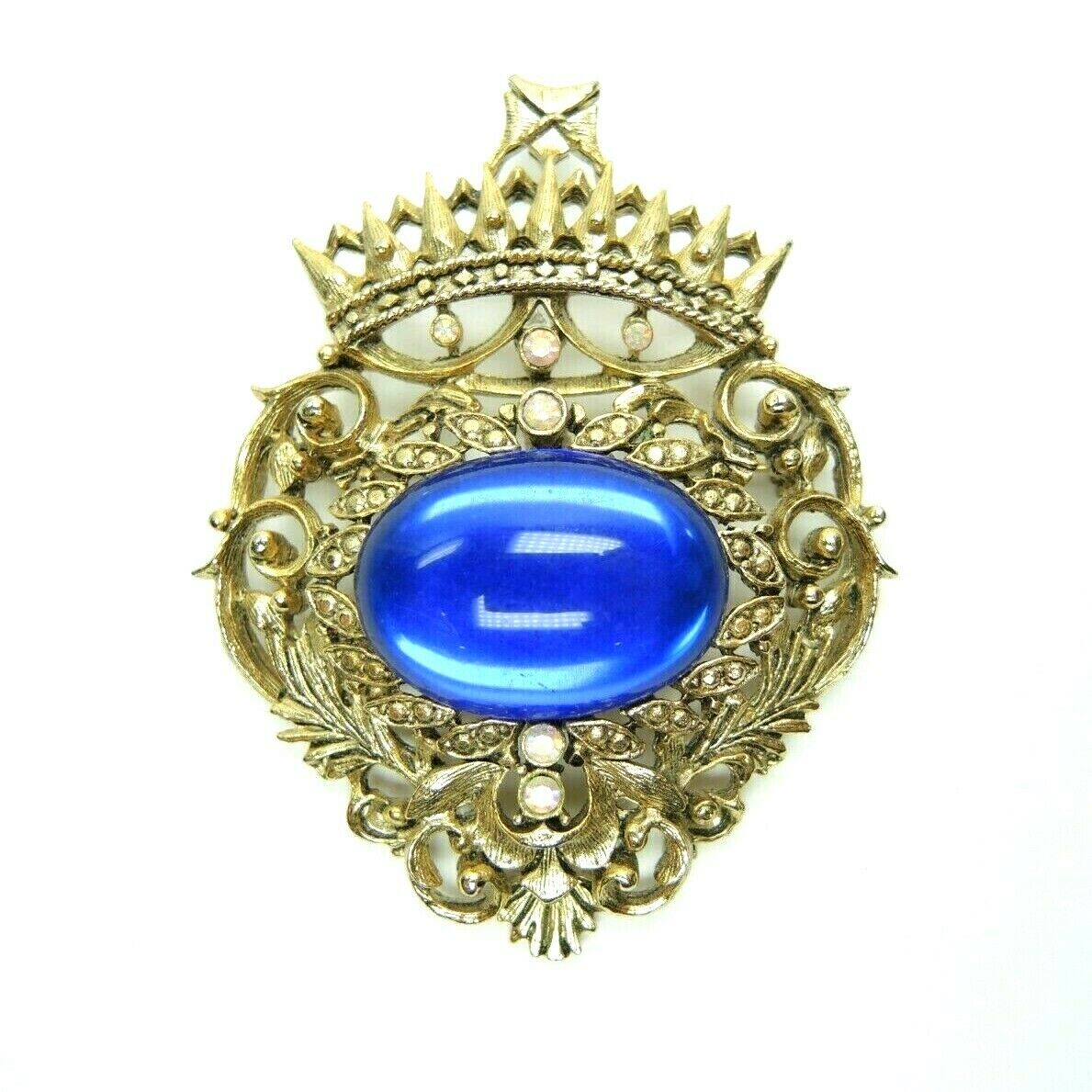 Vintage Crest Faux Blue Gem 2.5-inch Unsigned Gold-Tone Brooch Lapel Pin. This beautiful vintage brooch features a large blue faux gemstone in the center, surrounded by intricate gold-tone filigree and small white rhinestones. The brooch is designed in the shape of a crest with a crown at the top, adding a regal touch to any outfit. The gold-tone metal has a lovely vintage patina, and the brooch measures approximately 2.5 inches in diameter.