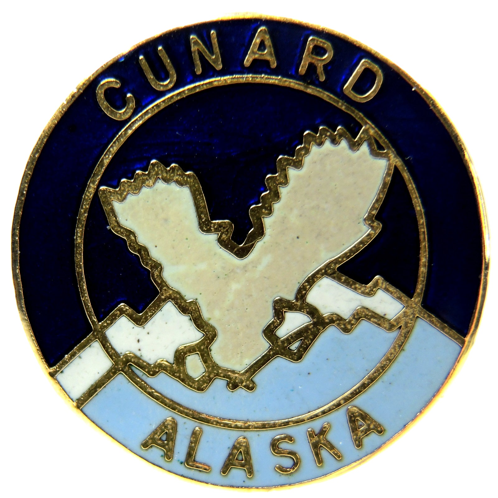 This is a Cunard Alaska Eagle Lapel Pin. It features an eagle with outspread wings, perched on a mountain range. The background is blue and white, representing the colors of the Alaskan flag.