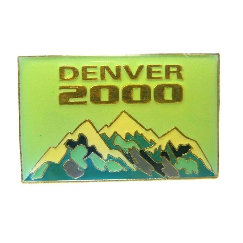 This is a rectangular souvenir lapel pin featuring a scenic depiction of mountains with the text DENVER 2000 prominently displayed. The design captures the essence of Denvers natural beauty and serves as a commemorative piece from the year 2000.