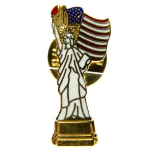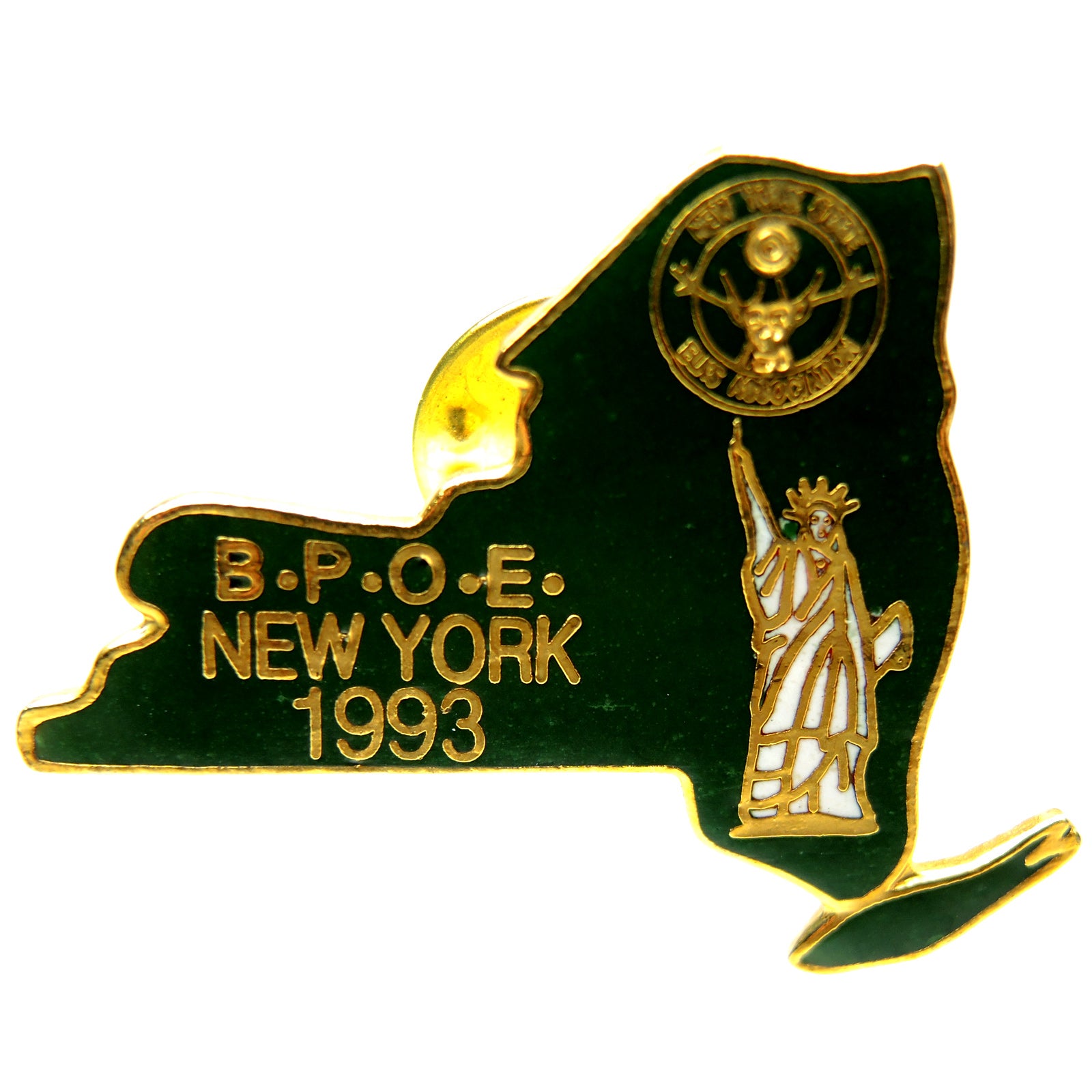 Description: This lapel pin features a green outline of the state of New York with gold accents. The Statue of Liberty is depicted on the lower right side, and above it is an emblem with a torch and the words B.P.O.E. The text NEW YORK 1993 is inscribed below the statue.