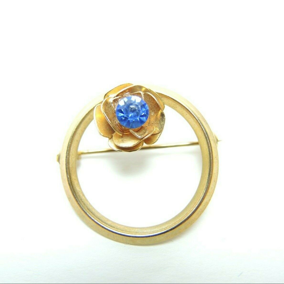 This is a vintage unsigned gold-tone brooch lapel pin featuring a faux blue gem flower. The brooch measures approximately 1.1 inches in diameter and has a classic, elegant design that would complement any outfit. It is an excellent addition to any jewelry collection or can be given as a gift to someone special.