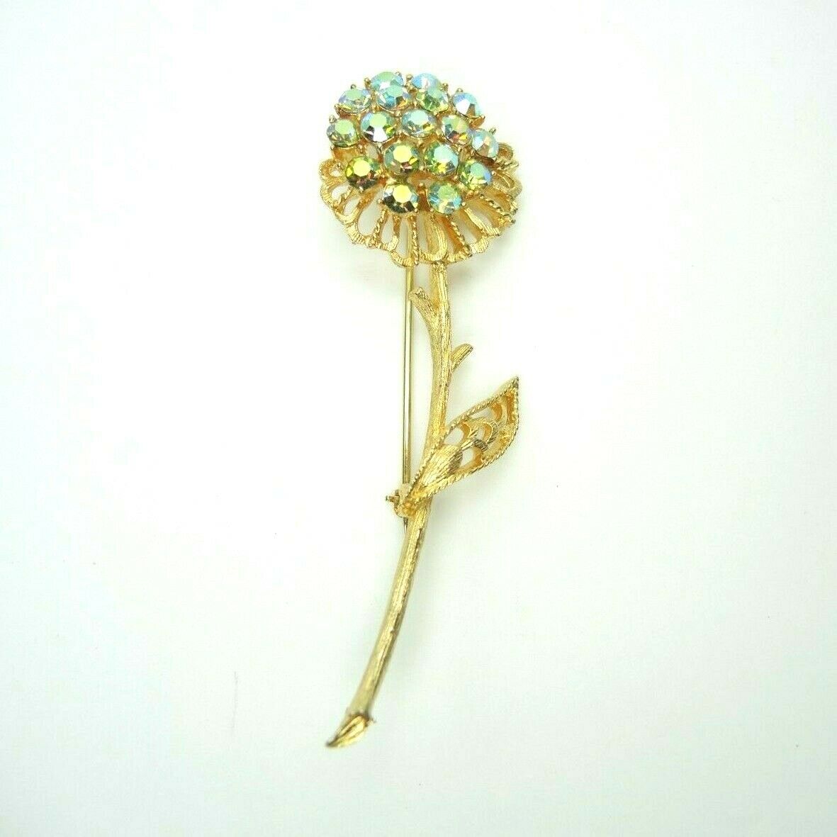 Flower Stem Faux Rhinestones 3.1-inch Vintage Unsigned Brooch Lapel Pin