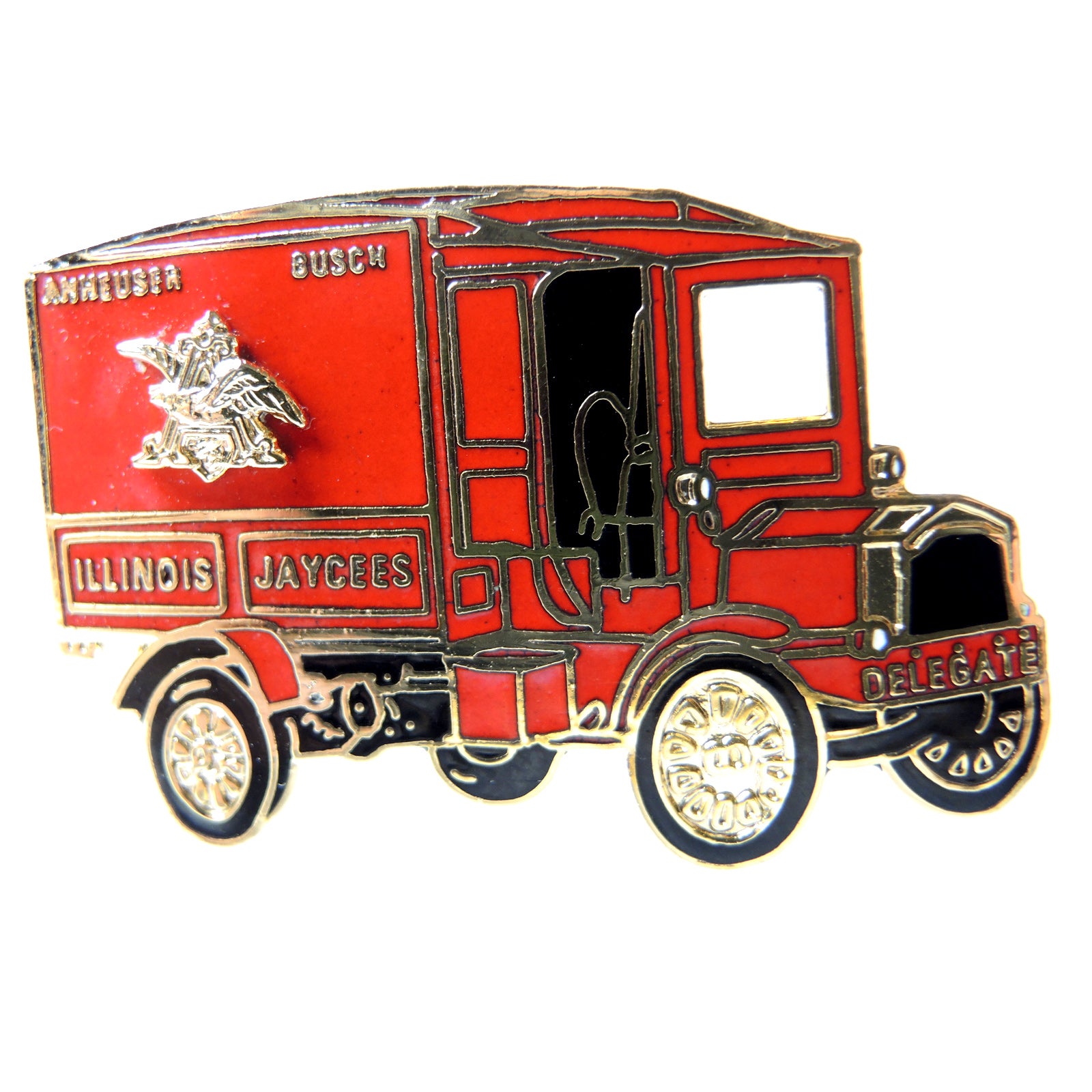 This lapel pin features a detailed design of an Illinois Jaycees delegate Budweiser beer delivery truck. The truck is depicted in vibrant red with gold accents, showcasing the intricate details and branding of the vehicle.