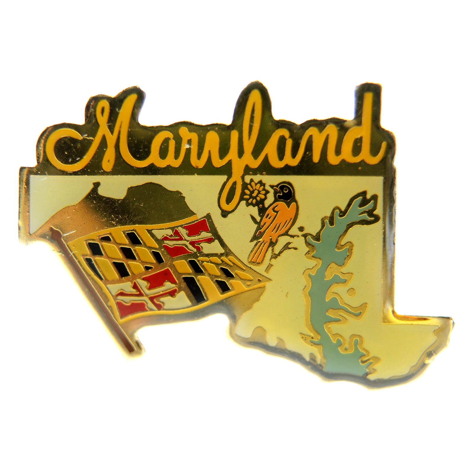 This beautiful Maryland State Outline Flag Baltimore Oriole Lapel Pin is a must-have for any collection.
