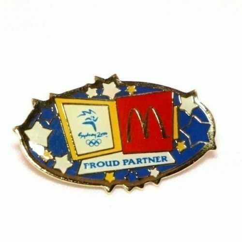 McDonald’s 2000 Sydney Olympics Sponsor Proud Partner Oval Stars Logo Lapel Pin. This is a vintage collectible pin from the 2000 Sydney Olympics. The pin features the Olympic rings and the McDonald’s logo with the words Proud Partner. It is in excellent condition.