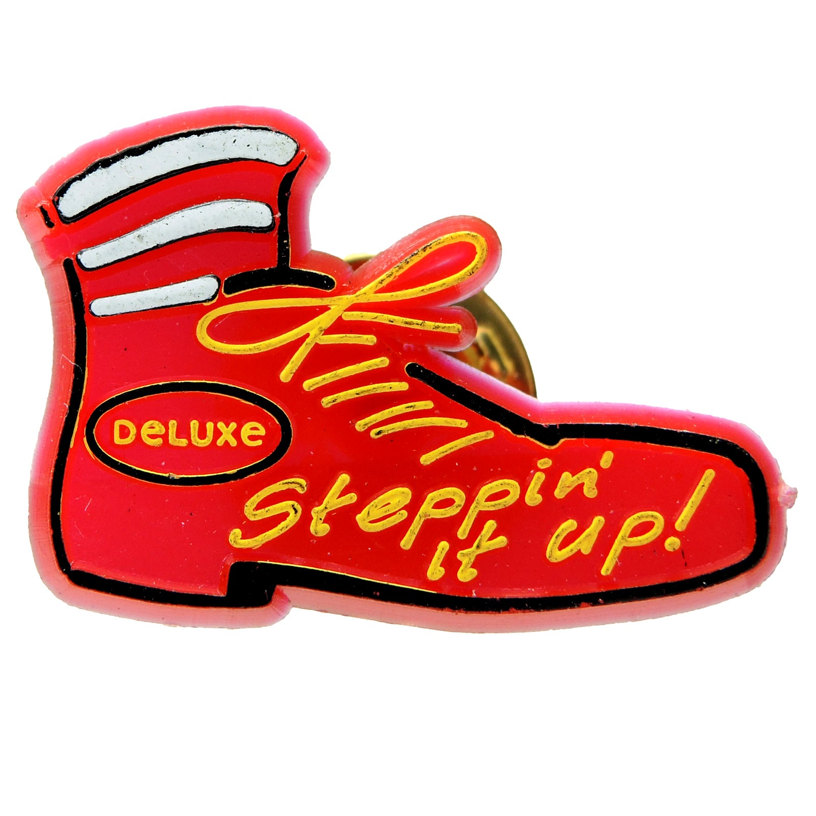 This McDonald’s Deluxe Ronald Shoe Steppin It Up Plastic Lapel Pin is a fun and collectible item for any fan of the fast food giant. The pin features a bright red shoe with a yellow bow and the words Steppin it up! written in bold letters.