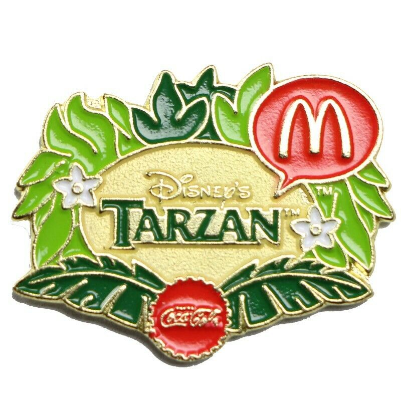 This is a lapel pin featuring the logos of McDonald’s, Disneys Tarzan, and Coca-Cola. It was likely given out as a promotional item. The pin has a gold background with green leaves and white flowers surrounding the text Disneys Tarzan. Above the text is a red speech bubble with the McDonald’s logo inside it. Below the text is a red seal with the Coca-Cola logo on it.
