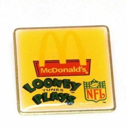 McDonald’s Looney Tunes NFL Football Lapel Crew Employee Pin Advertising Button. This is a vintage advertising button from McDonald’s featuring the Looney Tunes characters and the NFL logo. The pin has a yellow background with the McDonald’s logo at the top, followed by the Looney Tunes logo and the words Looney Tunes Plays. On the right side of the pin, there is the NFL logo. This pin was likely given to employees as a promotional item.