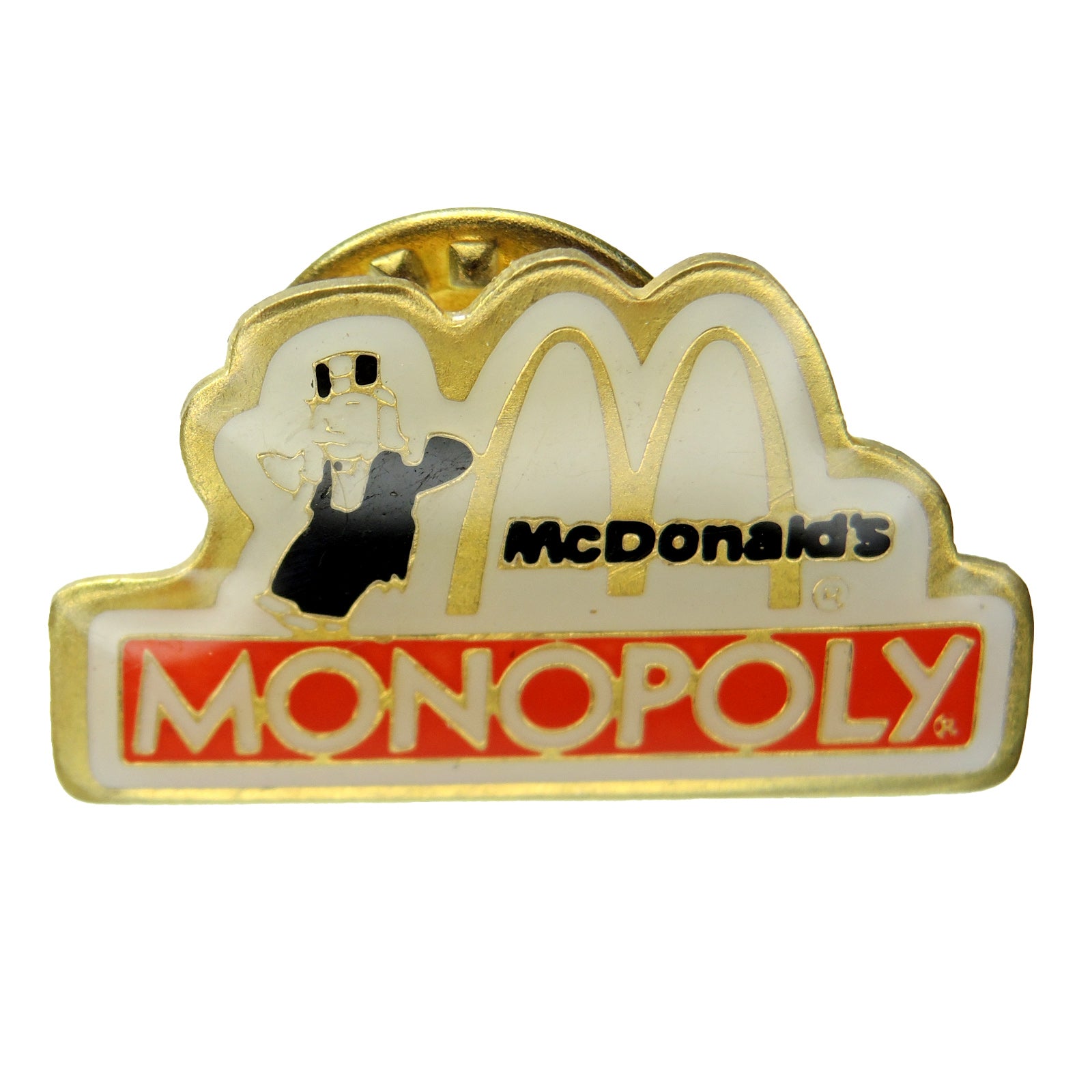 This is a vintage McDonald’s Monopoly lapel pin featuring the character Rich Uncle Pennybags from the game Monopoly. The pin was released in 1987 and is a collectible item for fans of both McDonald’s and Monopoly. The pin is made of metal and has a gold-tone finish with enamel details. It measures approximately 1 inch in diameter and has a standard pin back.