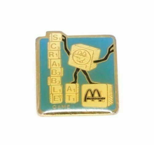 This McDonald’s Scrabble Lapel Pin features a character holding a McDonald’s bag. The pin is square-shaped and has a gold tone with enamel detailing. The character on the pin is depicted holding a McDonald’s bag, which has the McDonald’s logo on it. The background of the pin is blue, and there are Scrabble tiles with letters on the sides.