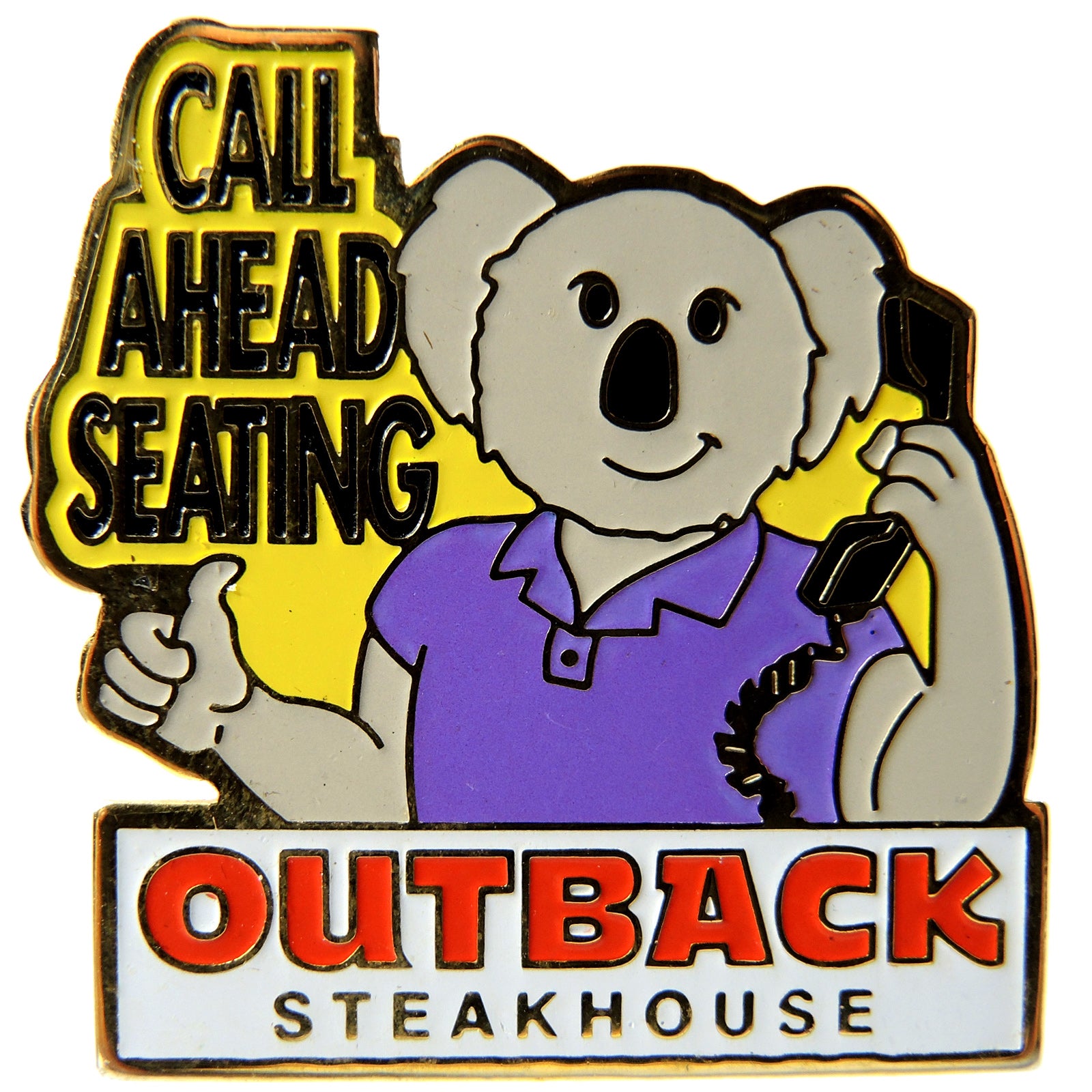 Outback Steakhouse Call Ahead Seating Lapel Pin. This is a fun collectible item for any Outback Steakhouse fan or employee. The pin features a cartoon koala bear wearing a purple shirt and holding a phone, with the text Call Ahead Seating and Outback Steakhouse prominently displayed.
