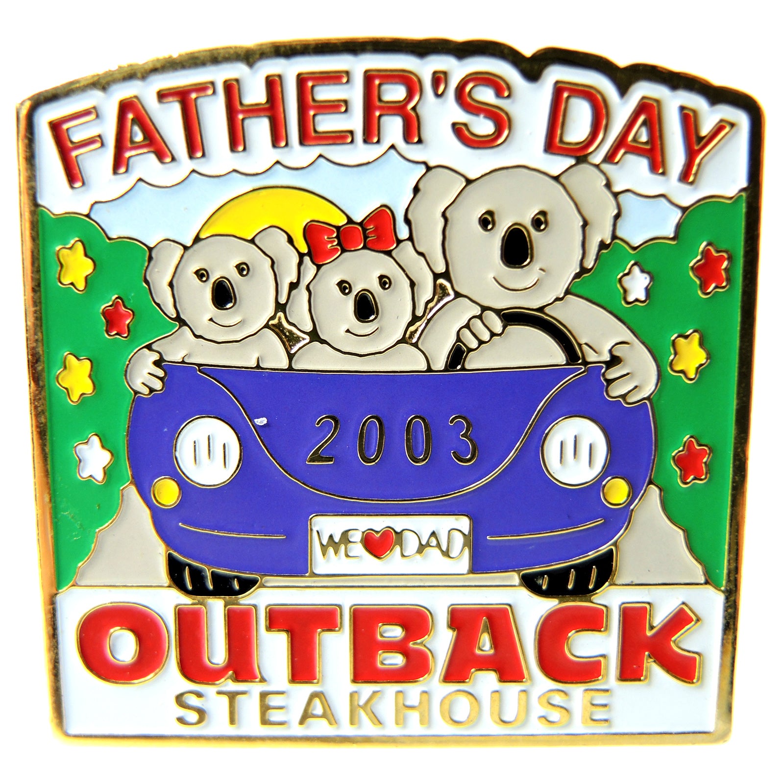 This lapel pin commemorates Fathers Day at Outback Steakhouse in 2003. It features a family of koalas in a blue car with the text Fathers Day 2003 and Outback Steakhouse.