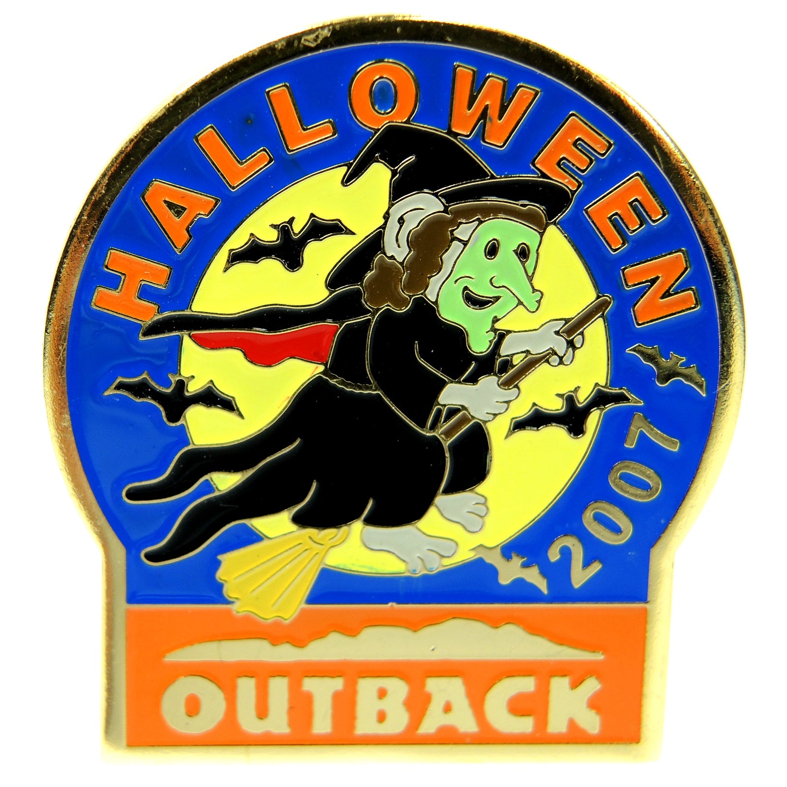 This is a lapel pin from Outback Steakhouse celebrating Halloween in 2007. The pin features a witch riding a broomstick against a full moon with bats flying around.
