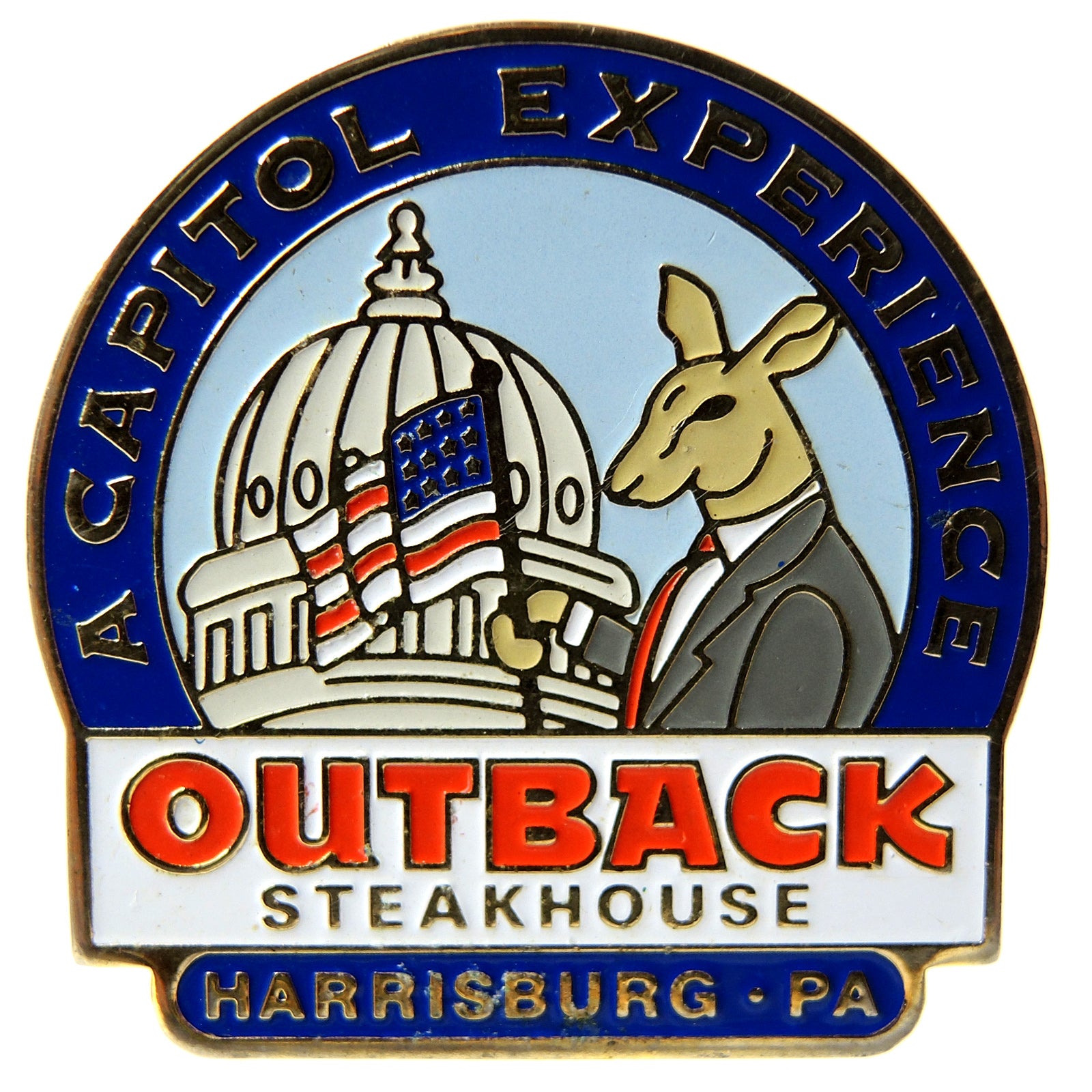 This lapel pin commemorates the Outback Steakhouse location in Harrisburg, Pennsylvania. The design features the iconic dome of the Pennsylvania State Capitol building and an illustration of a kangaroo dressed in business attire, holding an American flag.