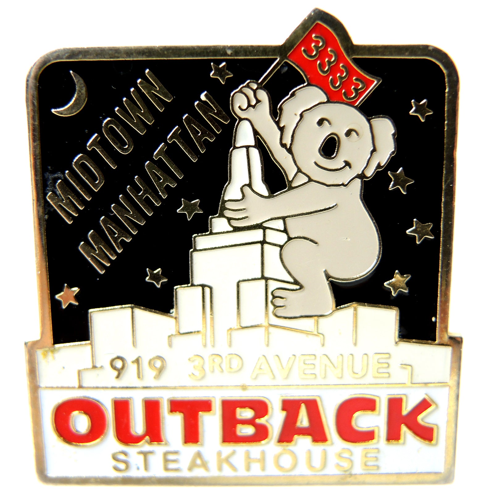 The Outback Steakhouse Midtown Manhattan NYC Lapel Pin is a collectible item that showcases the iconic koala bear mascot of the restaurant chain. The pin features a koala bear holding an Australian flag atop the New York City skyline, with the text Midtown Manhattan and 919 3rd Avenue Outback Steakhouse. This lapel pin is a great way to show your love for both Australia and New York City, as well as your appreciation for the delicious steaks served at Outback Steakhouse.