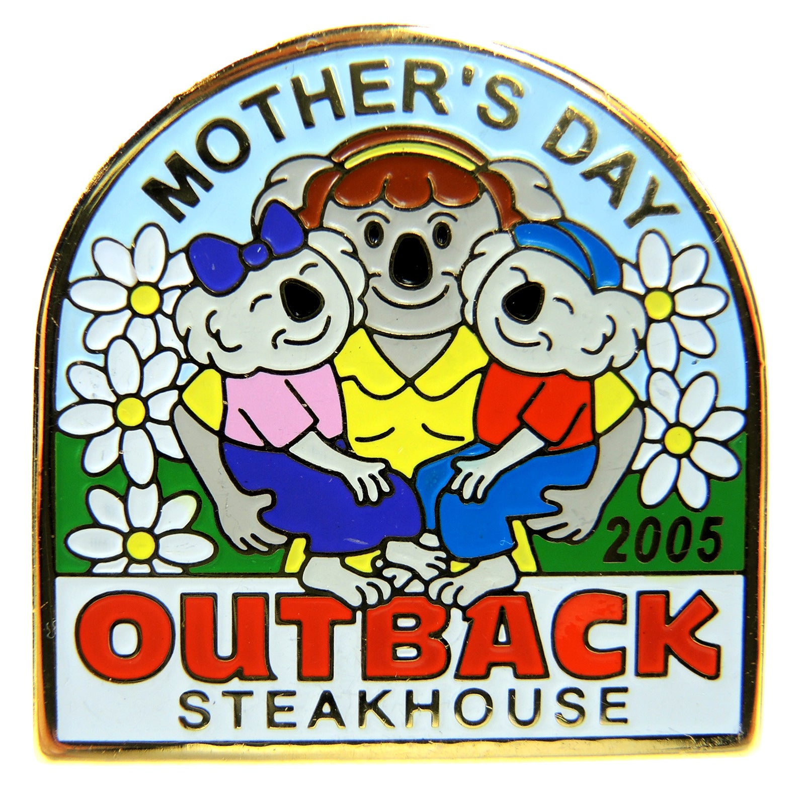 This lapel pin commemorates Mothers Day at Outback Steakhouse in 2005. It features a colorful design with cartoon characters and flowers.