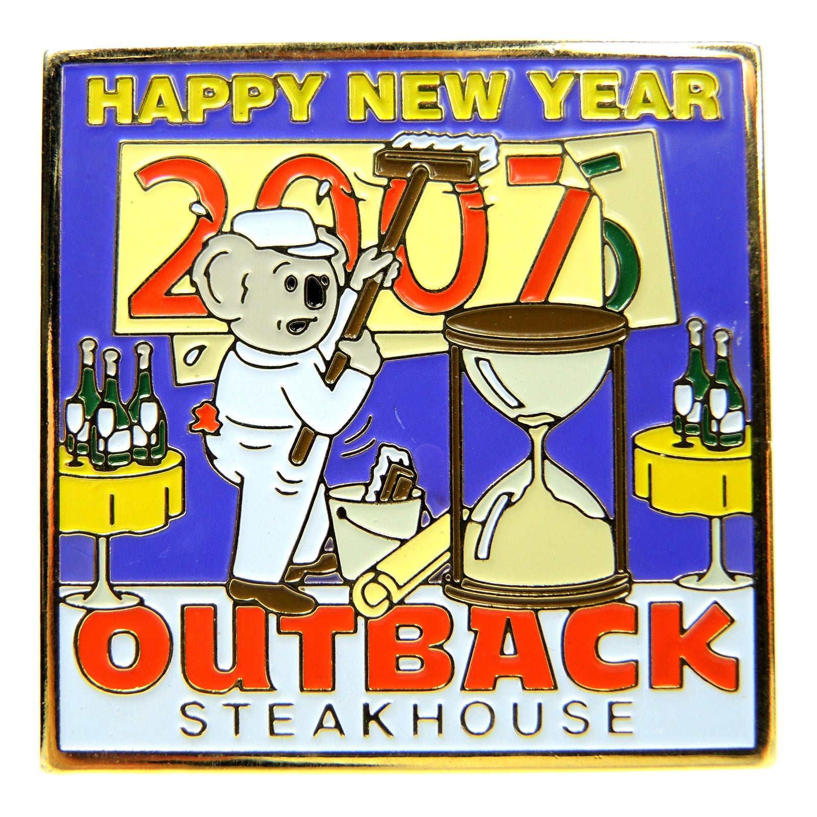 This lapel pin commemorates the New Years celebration at Outback Steakhouse in 2007. It features a chef character painting the year 2007 while holding an hourglass, symbolizing the passage of time.