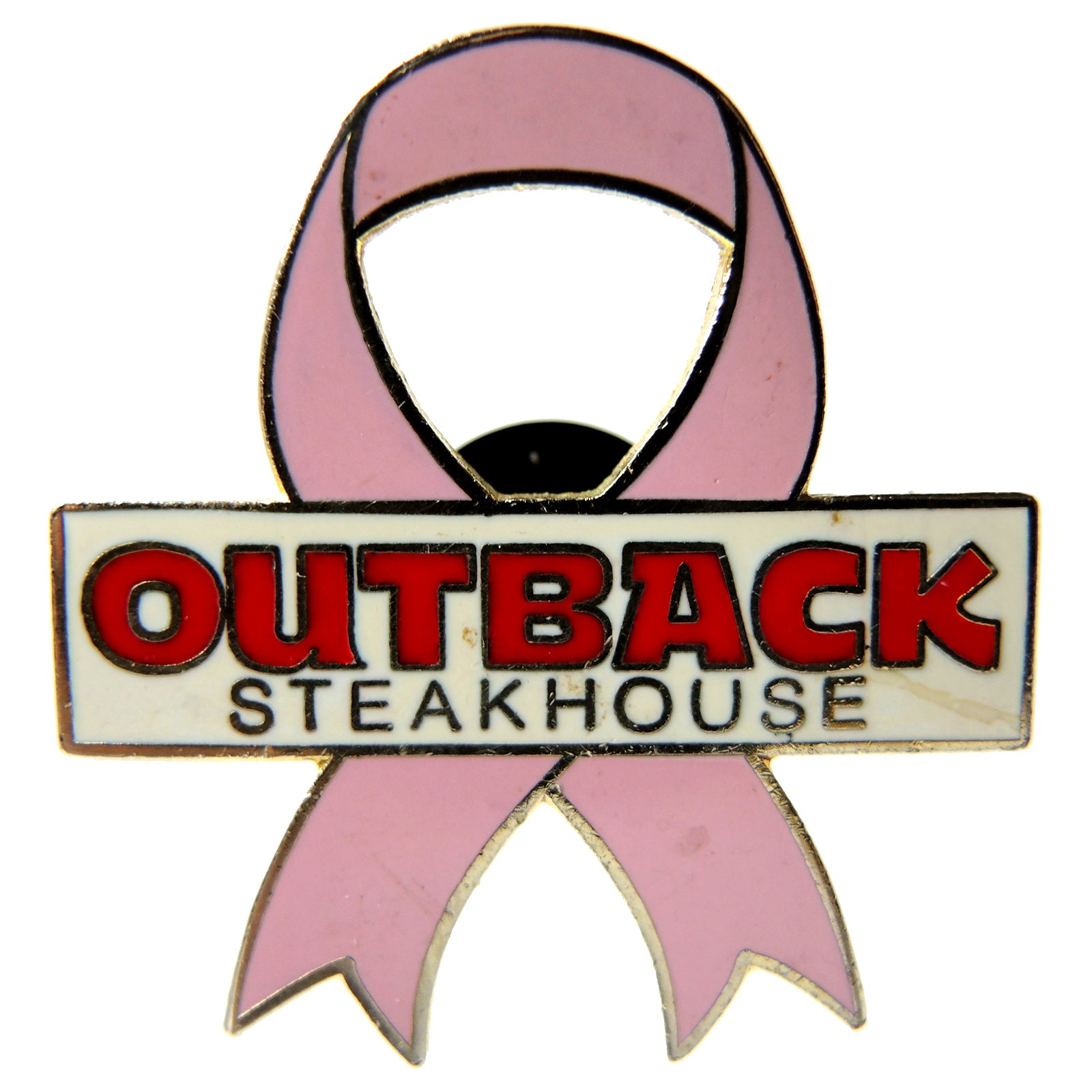 Show your support for breast cancer awareness with this Outback Steakhouse pink ribbon lapel pin. This pin features the iconic Outback Steakhouse logo in red and black on a white background, with a pink ribbon above it. The pin is made of enamel and has a standard pin back for easy attachment to clothing or accessories. Its a great way to show your support for breast cancer awareness while also showing your love for Outback Steakhouse.