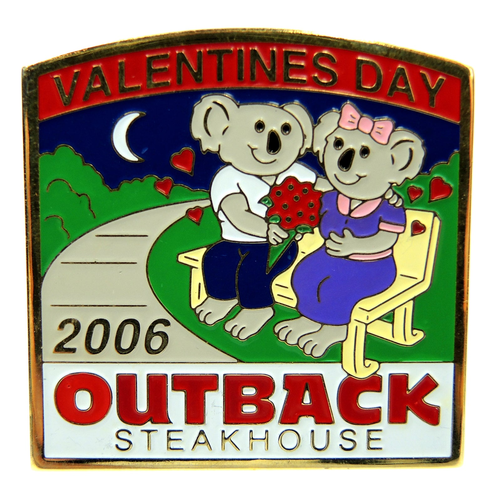 This lapel pin commemorates Valentines Day in 2006 at Outback Steakhouse. It features two koalas, a male and a female, sitting on a bench. The male koala is holding a bouquet of red roses, symbolizing love and affection.