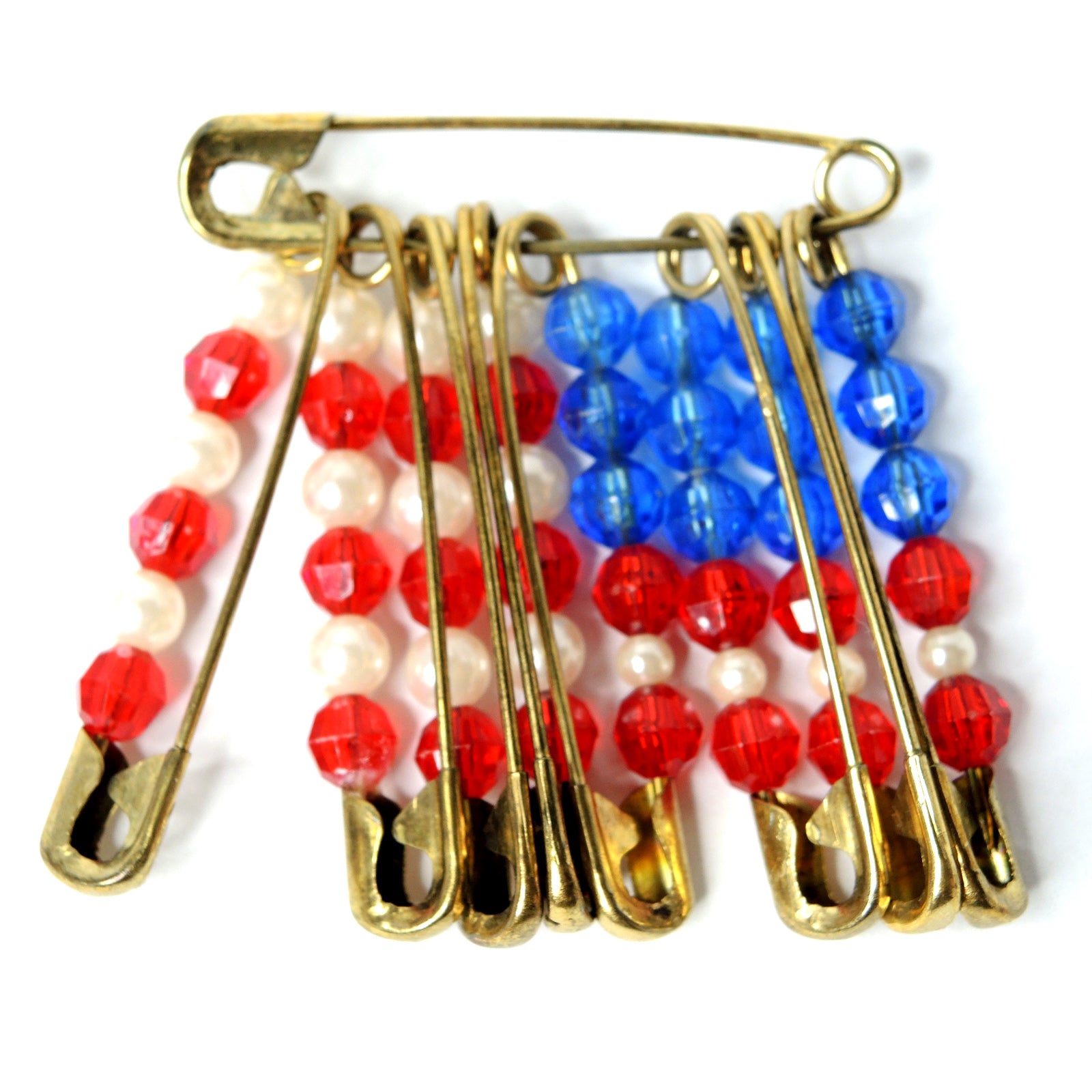 This patriotic safety pin features a handmade vintage design with beads in red, white, and blue to resemble the American flag. It is approximately 2 inches in size. Perfect for adding a touch of patriotism to your clothing or accessories. Handcrafted with care and attention to detail.