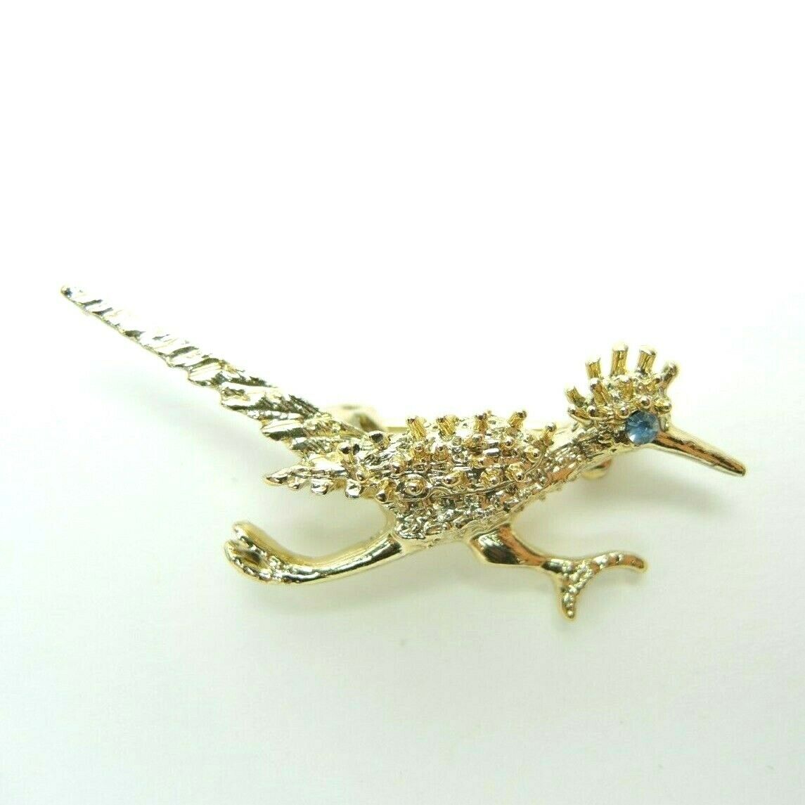 This is a vintage unsigned gold-tone brooch lapel pin featuring a roadrunner design. The pin measures approximately 1.7 inches in length and is in good condition. It has a secure clasp on the back and is ready to wear or display. This piece would make a great addition to any collection of vintage jewelry or Southwest-inspired accessories.
