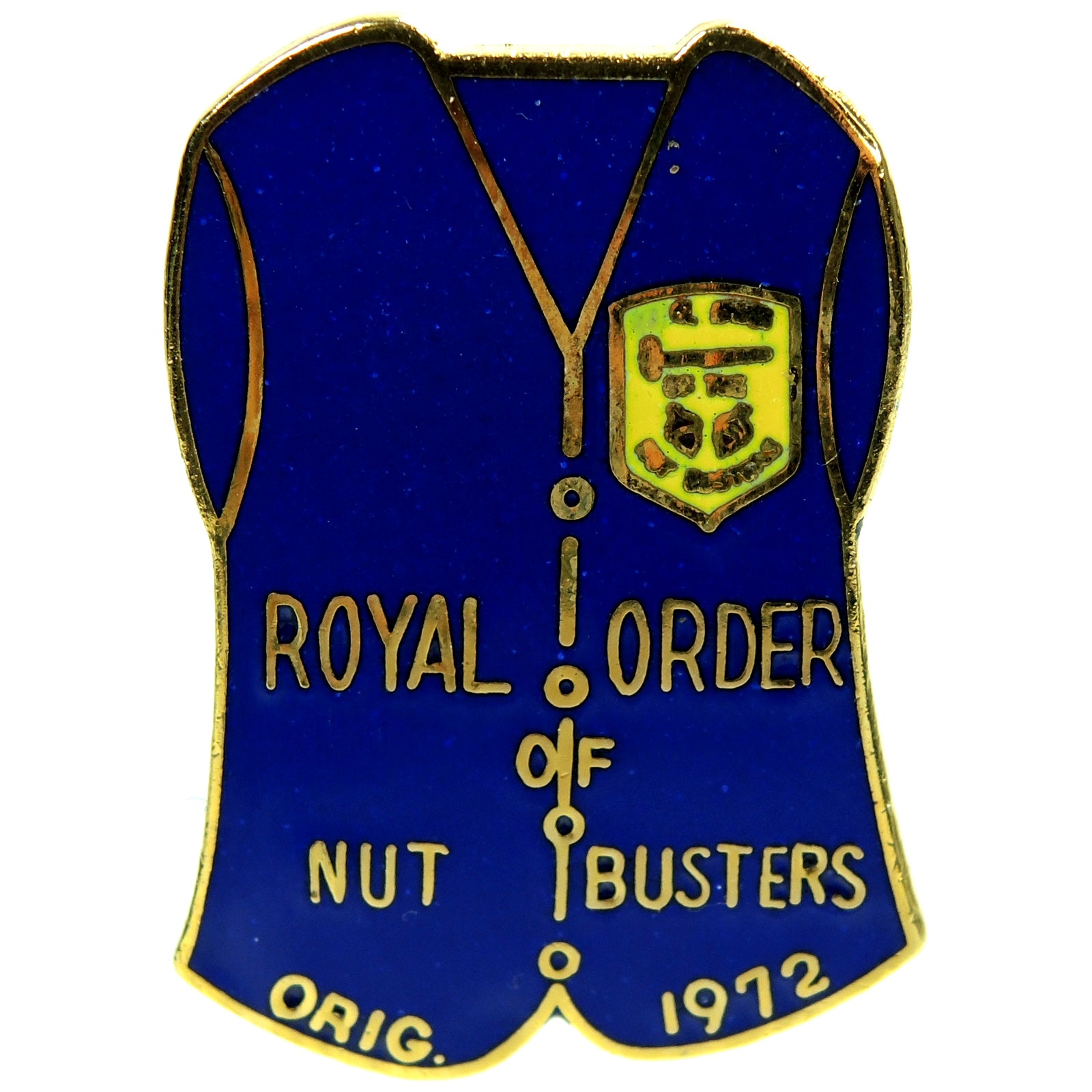 The Royal Order of the Nut Busters Lapel Pin is a unique and historical item that dates back to 1972. This pin is designed in the shape of a blue vest with gold trim, featuring the words Royal Order of Nut Busters prominently displayed across the front. On the left side of the vest, there is an emblem that includes a crown and various nuts, symbolizing the orders mission to promote nut consumption and appreciation.