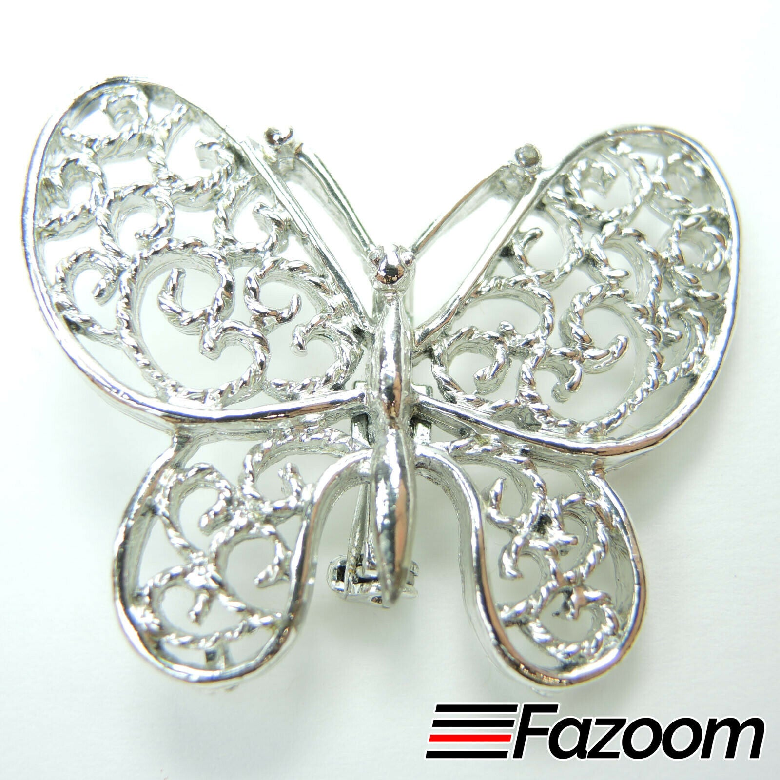 Vintage Silver-Tone Butterfly Brooch Lapel Pin. This beautiful butterfly brooch is a great addition to any collection. It features intricate filigree work and a classic silver-tone finish. The brooch measures approximately 2 inches by 1.5 inches, making it the perfect size for adding a touch of elegance to any outfit.