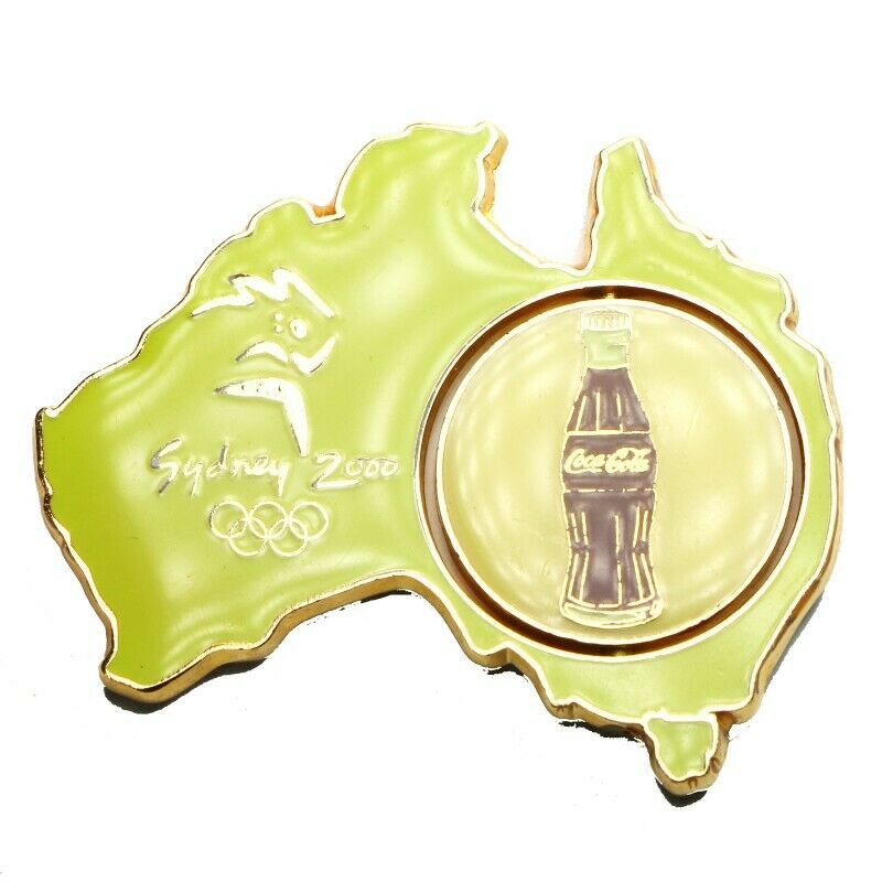 This is a Sydney 2000 Summer Olympic Games Australia Spinner Coca-Cola Sponsor Lapel Pin. It features the shape of Australia with the Sydney 2000 logo on one side and a Coca-Cola bottle on the other. The pin is made of metal and has a spinner mechanism that allows the Coca-Cola bottle to rotate. The pin is in good condition and measures approximately 1.5 inches by 2 inches.