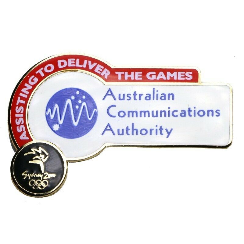 This lapel pin commemorates the Sydney 2000 Summer Olympic Games and highlights the role of the Australian Communications Authority in delivering the games. The pin features the logo of the Australian Communications Authority and the official emblem of the Sydney 2000 Olympics. The text on the pin reads ASSISTING TO DELIVER THE GAMES and Australian Communications Authority.
