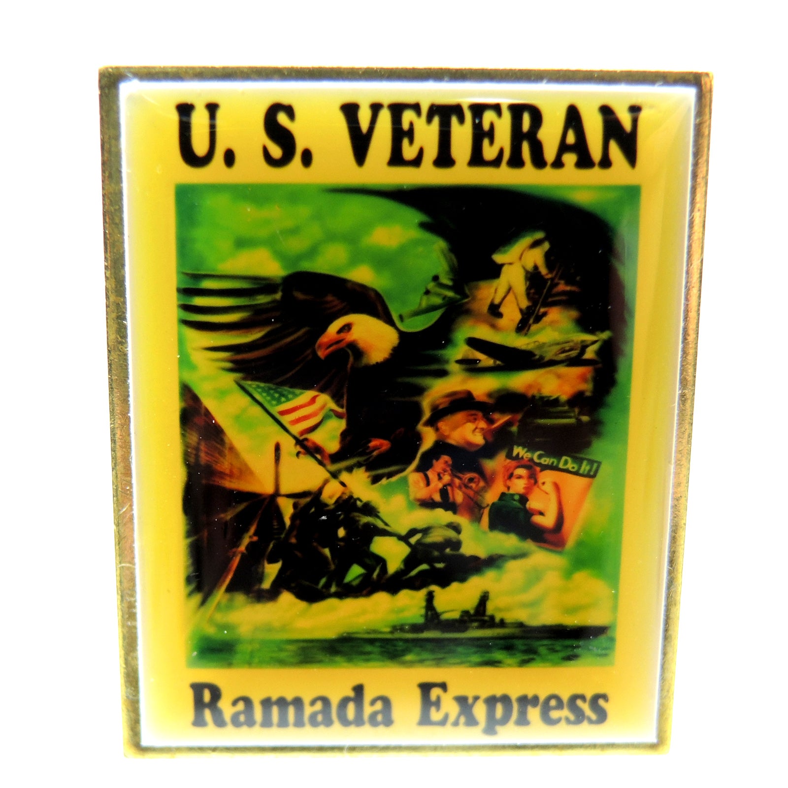 This is a lapel pin from the U.S. Veteran Ramada Express Hotel and Casino in Nevada. The pin features an eagle, soldiers, and a ship, with the text U.S. Veteran at the top and Ramada Express at the bottom.