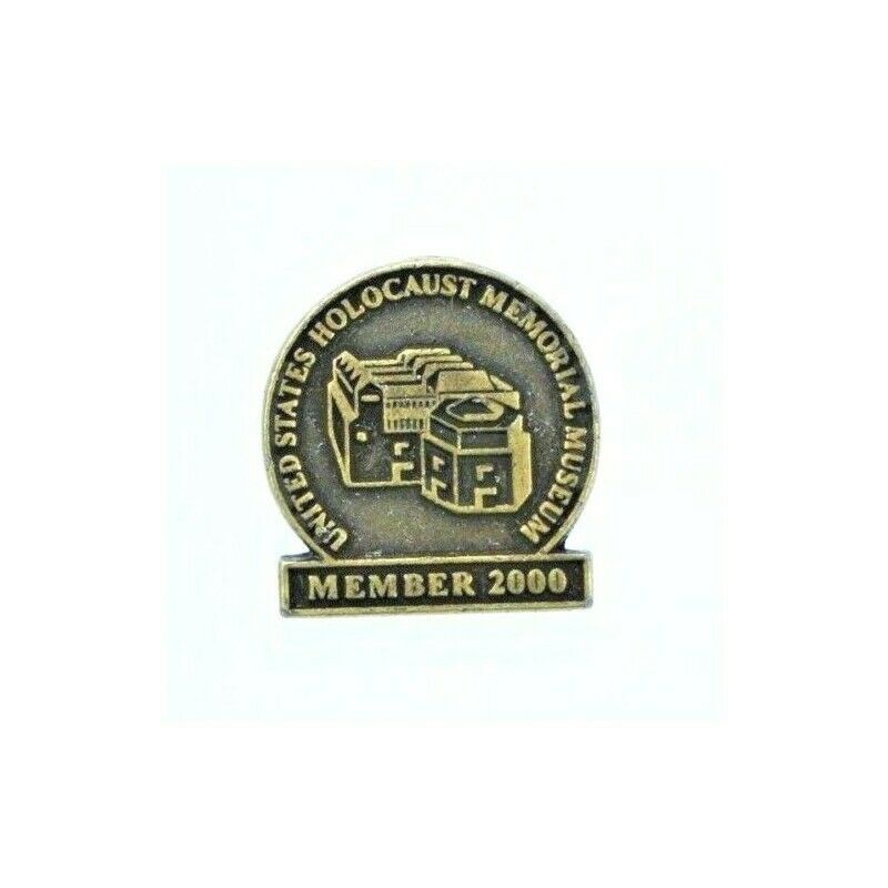 This lapel pin is a commemorative item from the US Holocaust Memorial Museum. It features a bronze tone design with the museums logo and the inscription Member 2000.