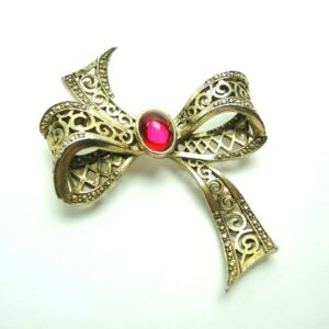 Bow with Faux Red Gem 2.4-inch Unsigned Gold-Tone Brooch
