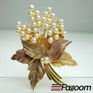 Gold-Tone Faux Pearl Cluster & Leaves Brooch Lapel Pin Vintage