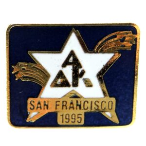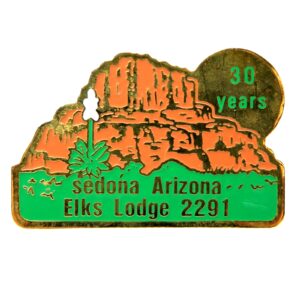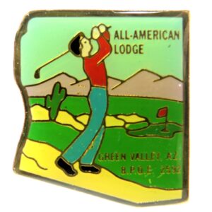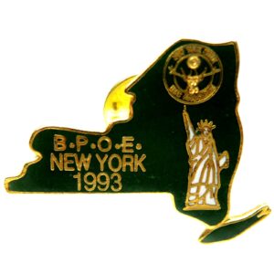 Lapel pins from various fraternal orders and societies, including Masonic, Elks, and Jaycees designs.