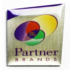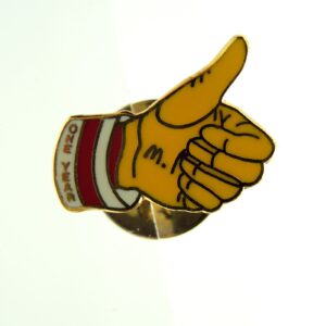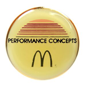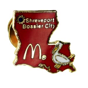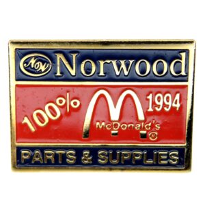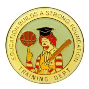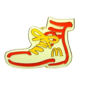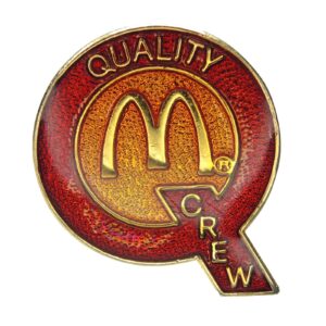 A collection of lapel pins from various dining establishments, fast-food chains, and iconic restaurant brands.